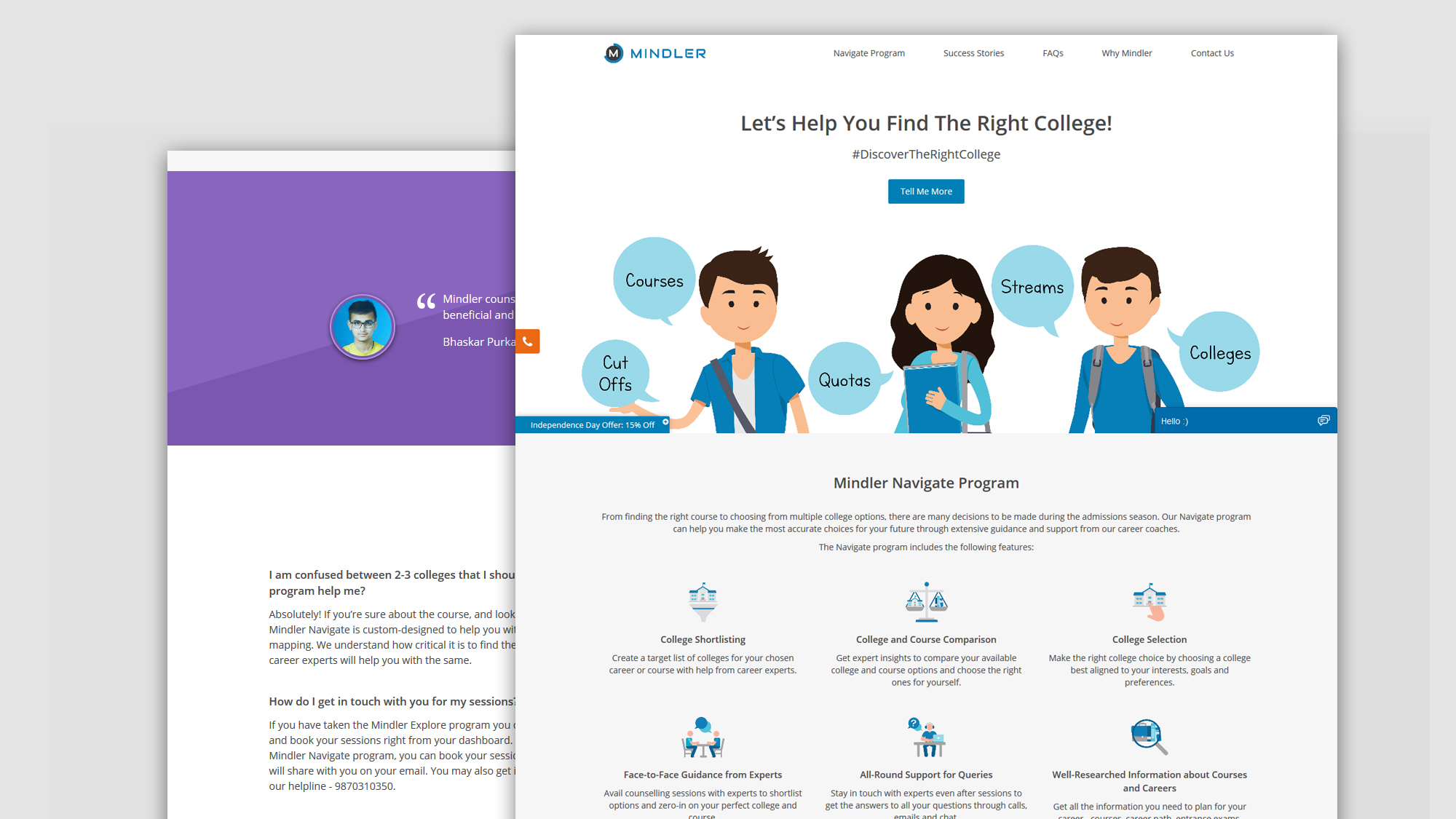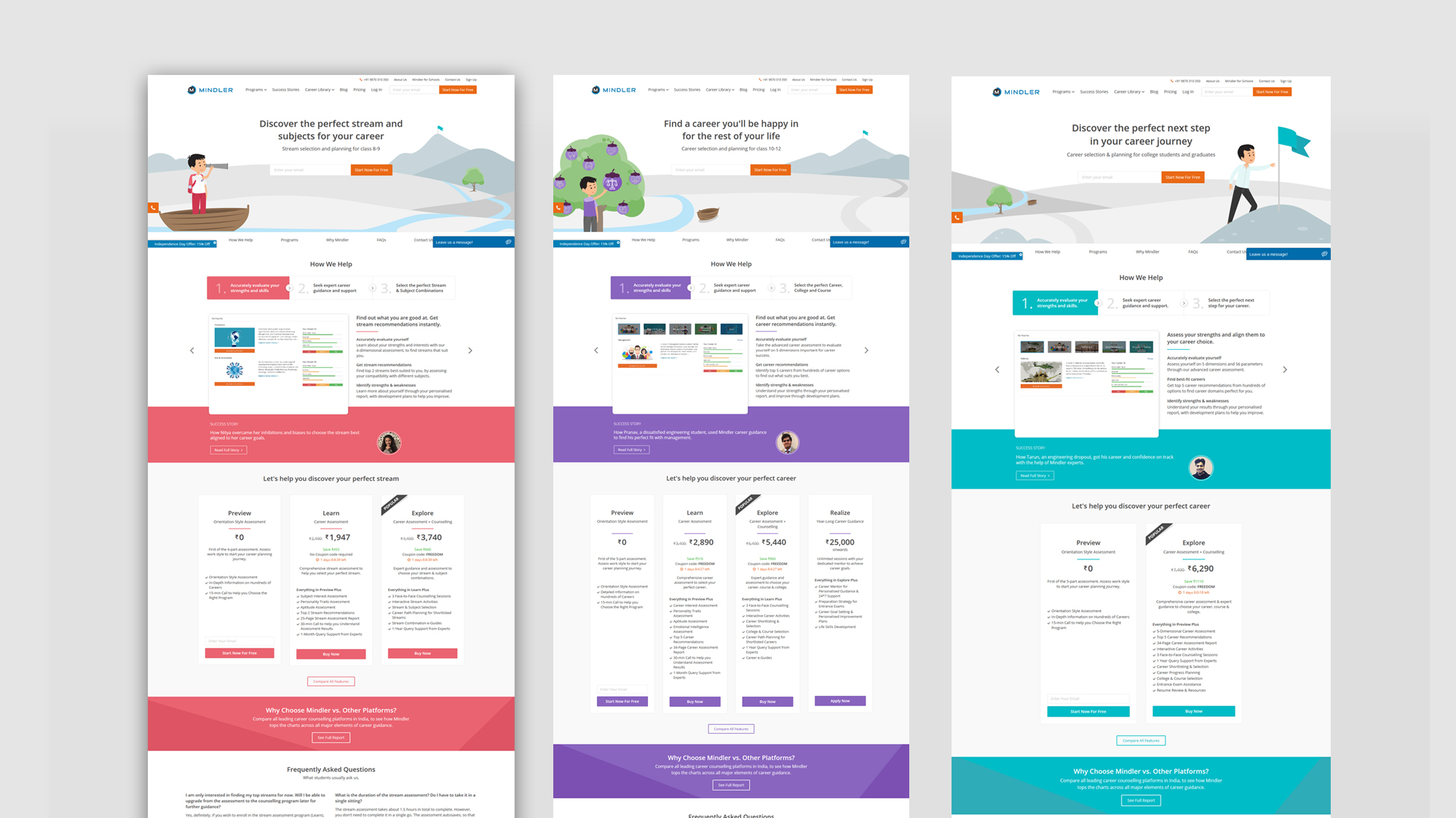 Problem - Mindler people had all the content and idea/concept what they have to do with, but they were stuck as they are not good sound with technologies and their advantages/disadvantages in terms of competitors and other challenges ie-how target audience will use, should have very user-friendly an with cool concept visualization. Also, they want should not look like older version concept site and also this should math with the age group and other mindset of target audiences.